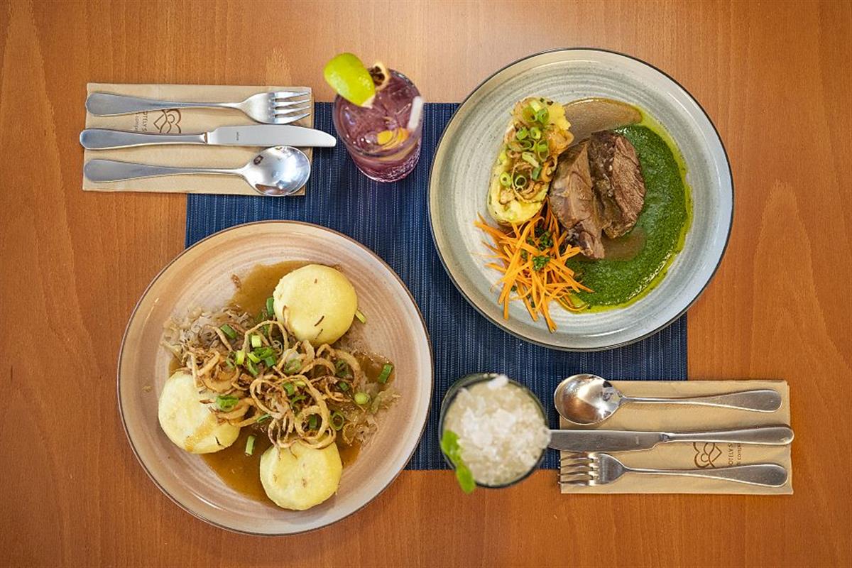 Das Hotel ist durch seine ausgezeichnete Küche bekannt, die die Spezialitäten der böhmischen sowie ausländischen Küche bietet. Im Preis für die Unterkunft ist Frühstück in der Form des warmen und kalten Büfetts enthalten. Das Mittagessen kann man aus drei Gerichten oder als á la carte wählen, das Abendessen kann man als á la carte bestellen oder als warmes Büfett erhalten. Zur Verfügung stehen ein Eßraum mit der Kapazität von 150 Plätzen, ein Restaurant - 60 Plätze, eine Snackbar - 50 Plätze und in der Sommerzeit eine Sommerterrasse.
